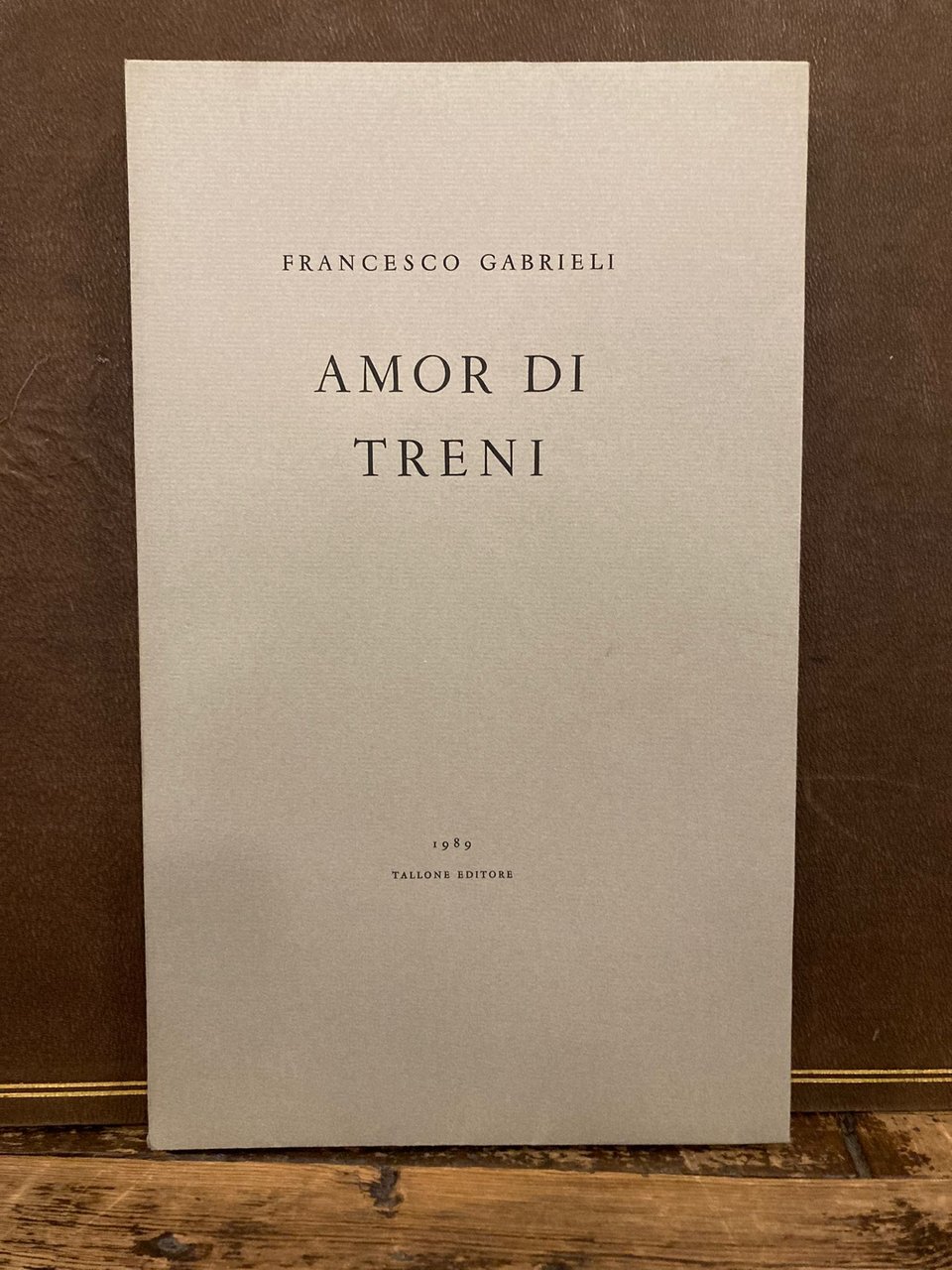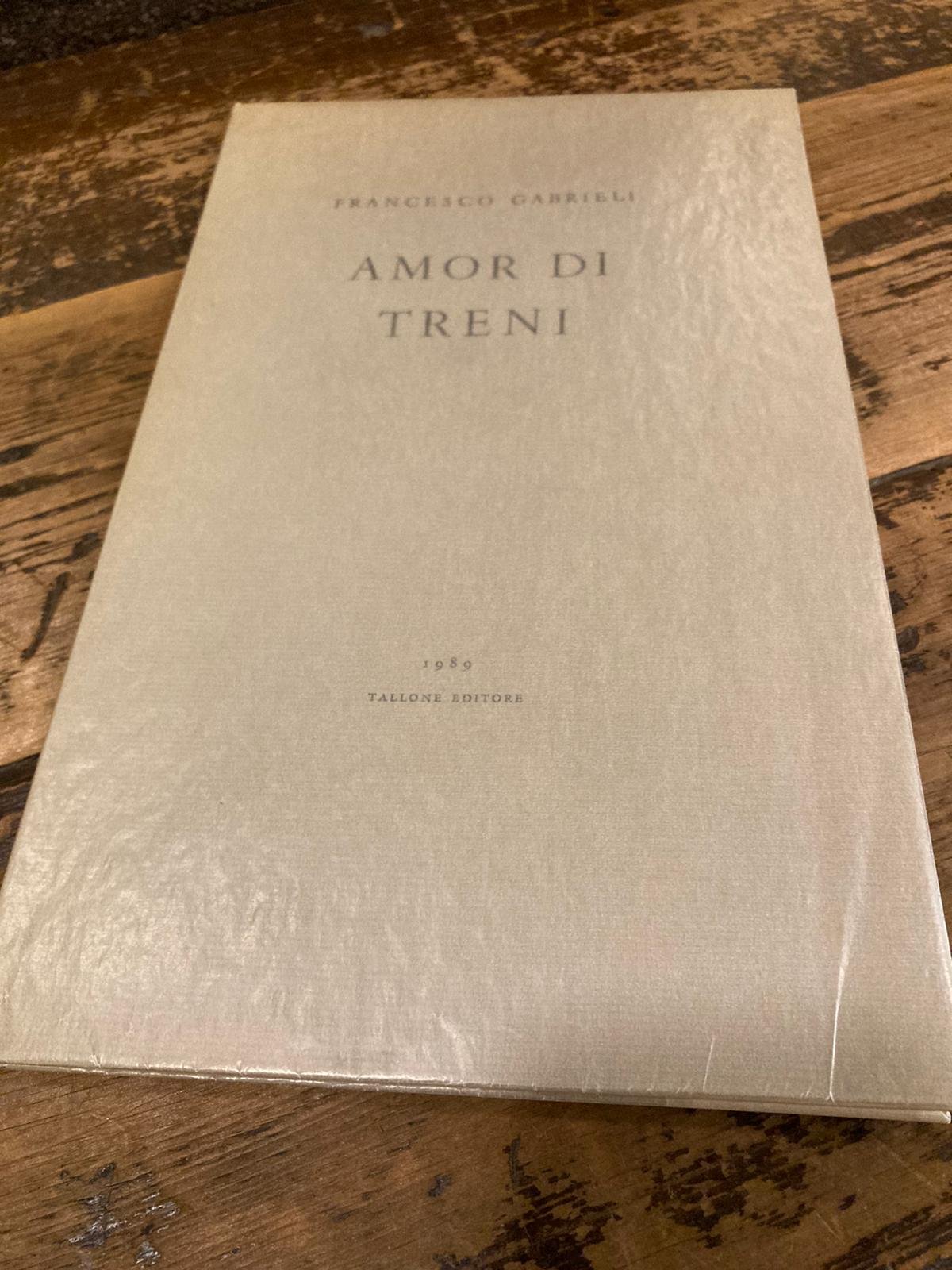 In-8° (28x17 cm), pp. (48), brossura editoriale carta da zucchero incamiciata con titoli in nero al dorso e al piatto anteriore. Ottimo e fresco esemplare con dedica autografa dell' autore alla carta bianca anteriore. Edizione fuori commercio (140 esemplari non numerati), pubblicata per celebrare il centocinquantesimo anniversario dell'inaugurazione della prima ferrovia in Italia, di questo curioso saggio autobiografico d'occasione che l'autore diede già in parte alle stampe nel 1960 per la laurea del figlio. Una copia venne inviata anche ad Alberto Tallone anch'esso appassionato di antichi treni e storia delle ferrovie e, a distanza di 30 anni, gli eredi Tallone e Francesco Gabrieli celebrano l'avvenimento con questa pubblicazione.