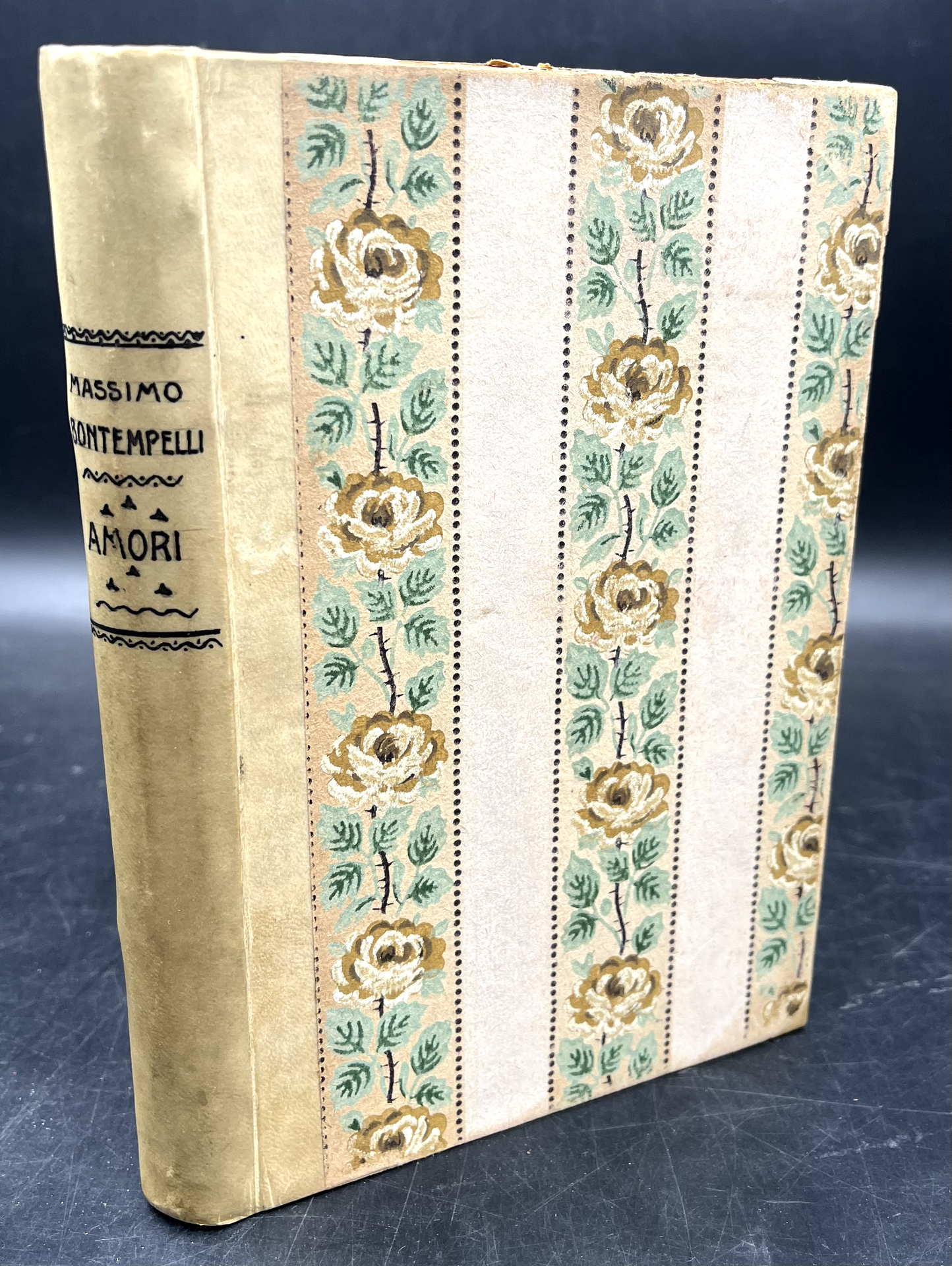 In-8° (cm. 19,4), pp. 285. Timbro edit al front. Legatura da amatore in mezza pergamena e angoli, carta decorata con fiori a colori ai piatti, titolo e fregi a china tracciati impeccabilmente a mano al dorso, nastrino segnalibro, tagli. rossl. BONTEMPELLI, a Torino allievo di Arturo Graf e di Giuseppe Fraccaroli, insegnò Lettere a Cherasco e poi ad Ancona, dal 1910 giornalista a Roma, scrittore e compositore. "Amori" figura in wiki tra le opere "rifiutate" poi dal Bontempelli; fa parte di opere giovanili il cui "timbro stilistico dominante è quello di un intimismo macerato d'ironia malinconica" (Treccani), precedenti la svolta futurista e d'avanguardia maturata durante la Grande Guerra dal Bontempelli che fu poi amico di Savinio e De Chirico, e tentò esperimenti surrealisti di "realismo magico". Rarissima opera, trascurata dalla critica, da studiare !
