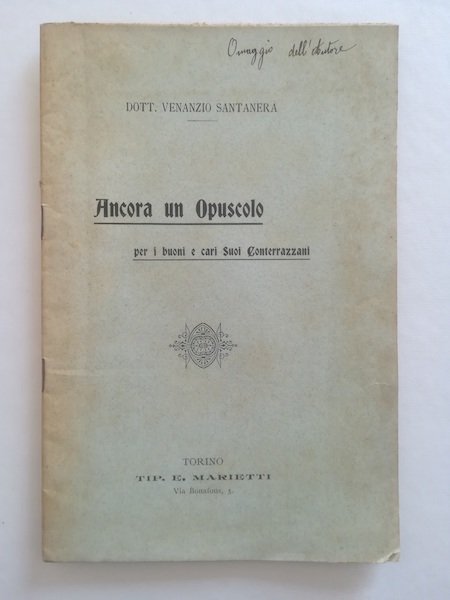 In 16 (cm 13,5 x 20), pp. 24. Omaggio autografo al piatto anteriore. Brossura editoriale. Opuscolo scritto da Venanzio Santanera, medico-chirurgo operante a Torino, originario di Villafranca d'Asti, in cui l'A. racconta brevemente gli inizi della sua carriera per poi soffermarsi su un fatto di cui fu anch'egli vittima, ovvero il crollo delle sue azioni dell'Istituto Bancario (Banca Sarda prima, poi Nazionale e quindi d'Italia) per la errata gestione del direttore Grillo, succeduto a Bombrini. La banca dovette peraltro sobbarcarsi il salvataggio delle due Banche di Roma (Tiberina ed Esquilino) nonche' la liquidazione della famosa Banca romana.
