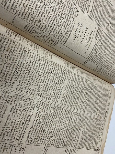 In 4°, p.pelle , cc.nn. 14 + pp. 724 + cc.nn. 49. Front. su ricca inc. a tutta p. di Gaultier. Nervi. Capilettera. Finalina. Lievi gore al marg. sup. Antichi forellini che solo raramente ledono alcune lettere. Abrasioni e lievi mende al d. ed ai piatti.