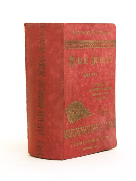 Nombreux renseignements sur les tribunaux, la préfecture, la mairie. liste par profession et liste alphabétique des commerçants, industriels, propriétaires, rentiers et de sa banlieue, 1 vol. fort in-12 reliure pleine percaline rouge éditeur, G. Delmas, Bordeaux, 1913, 1406 pp. Etat moyen (second mors fendu sur la longueur, grande carte dépliante détachée et en piteux état, bon état par ailleurs). Une source incontournable pour la connaissance de Bordeaux à la veille de la première guerre mondiale. Prix en l'état.