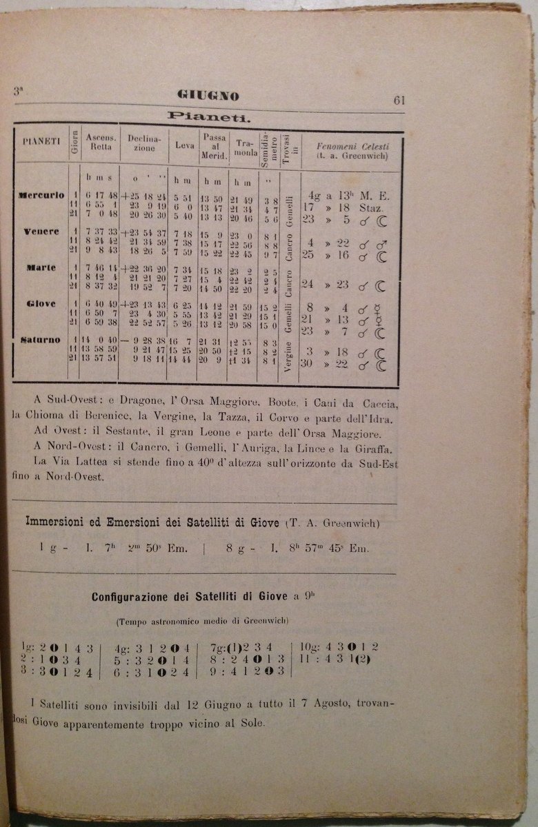 Opuscolo, Annuario Astro-Meteorologico con Effemeridi Nautiche anno 13, 1895 Tip. Mutuo Soccorso fra Compositori Tip. S. Luca, Venezia, 1894; cm. 20,5x14,5; pp. 163; con tabelle n.t.; Annuario Astro-Meteorologico con effemeridi nautiche, anno 13, 1895; brossura editoriale (senza brossura anteriore). Condizioni di conservazione Esemplare in buono stato con tracce d'uso e del tempo; brossura editoriale anteriore mancante; brossura posteriore con alcune pieghette; dorso fessurato con mancanze; interni compatti con minime fioriture. OPEB.5021 MT