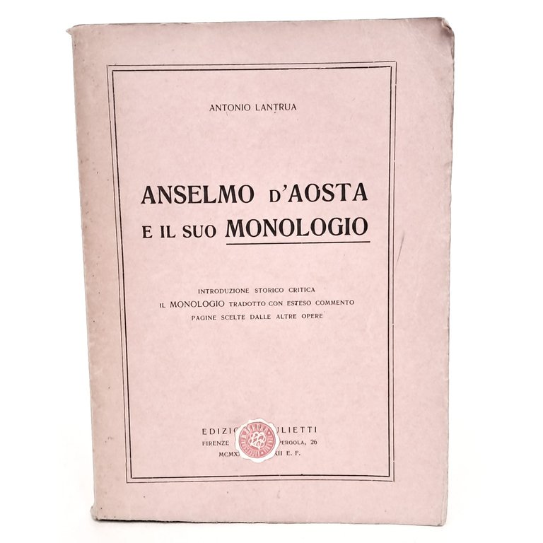 Introduzione storico critica il monologio tradotto con esteso commento pagine scelte dalle altre opere. Con dedica autografa del traduttore. Il Monologion ("soliloquio") è un saggio di teologia scritto dal monaco e filosofo cristiano Anselmo d'Aosta nel 1076. Il testo, che è la prima opera filosofica scritta da Anselmo, è incentrato sull'analisi degli attributi divini e sul problema di dimostrare l'esistenza di Dio non con argomenti a priori (cioè basati su una definizione della divinità a sua volta fondata sulla fede nella rivelazione contenuta nella Bibbia), ma piuttosto con argomenti a posteriori (basati cioè su evidenze tratte dal mondo sensibile e sviluppate con procedimenti razionali). Brossura. Pp. 305. Buone condizioni.