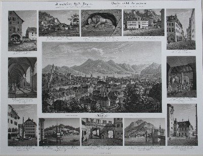 Aquatinta, Plattengrösse 41 x 54 cm, Blattgrösse 50 x 63 cm, gerahmt. Wespe 93. - Gruppenstich mit grossem Mittelbild und 12 Randansichten. Das Mittelbild trägt den Titel: "Luzern. Vom Gütsch gegen den Rigi aufgenommen," die Randbilder: "Gibraltar und das Frauenkloster im Bruch." - "Denkmal der Schweizer vom 10. August 1792." - "Das Spendhaus (in der Senti) gegen den Gütsch." - "Das Iesuiten-Kollegium." - "Der Marktplatz unter der Egg." - "Das Rathhaus und Sitz der Tagsatzung." - "Der Wasserthurm von der Seeseite gegen den Pilatus." - "Der Eingang auf die Hofbrücke und das Thor gegen den See." - "Die Schifflände am Hofthor gegen die Hofkirche und Brücke." - "Der Brunnen auf dem Weinmarkt." - "Der Kreuzgang und der Kirchhof im Hof." - "Die Kaserne und das Zeughaus." - Druckqualität und Erhaltungszustand sind aussergewöhnlich gut. - The indicated shipping costs refer to books weighing up to one kilogram. - Bücher, die schwerer als ein Kilogramm oder größer als 35 x 25 cm sind, werden als Paket verschickt und kosten innerhalb Deutschlands bis zu zwei Kilogramm 6 Euro, darüber hinaus 7 Euro Porto. -