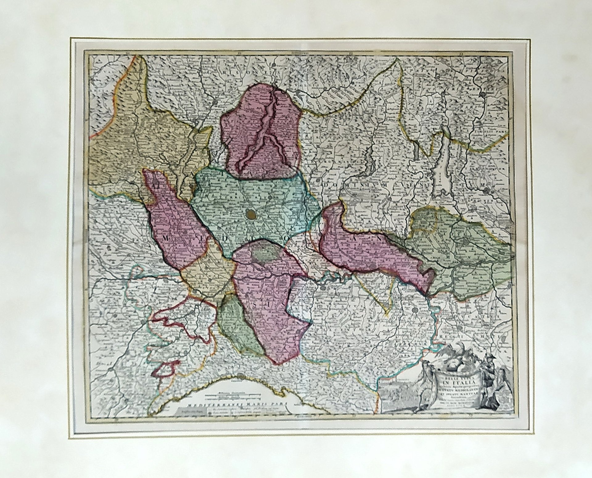 Edizione: johann baptist homann (geografo e cartografo) 㨠nato a oberkammlach vicino a kammlach nell'elettorato bavarese sebbene avesse studiato in una scuola dei gesuiti e si stesse preparando per la carriera ecclesiastica, alla fine si convert㬠al protestantesimo e dal 1687 lavor㲠come notaio di diritto civile a norimberga. ben presto si dedic㲠all'incisione e alla cartografia; nel 1702 fond㲠la propria casa editrice. mor㬠a norimberga nel 1724 - carta appartenente all'atlante: grosser atlas (126 carte) pubblicato nel 1707 e contenente anche alcune carte precedentemente stampate nel 1702.