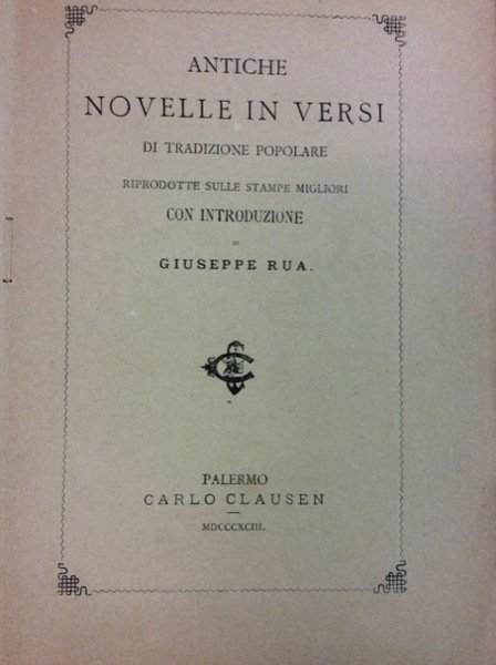 ANTICHE NOVELLE IN VERSI DI TRADIZIONE POPOLARE RIPRODOTTE SULLE STAMPE MIGLIORI CON INTRODUZIONE DI GIUSEPPE RUA. - Volume XII di "Curiosita' popolari tradizionali pubblicate per cura di Giuseppe Pitre".