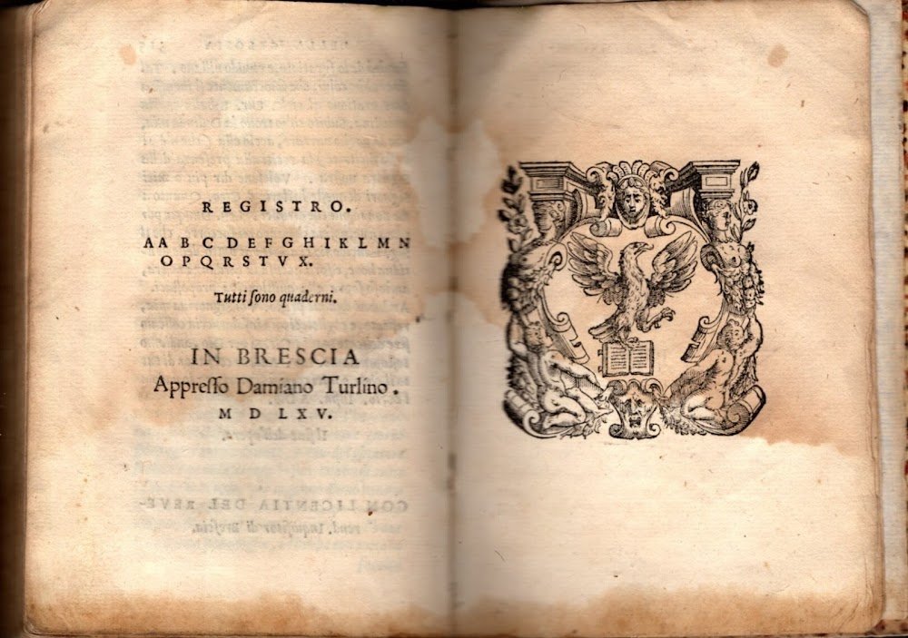 Grande marca tipografica al frontespizio ed in fine all'opera