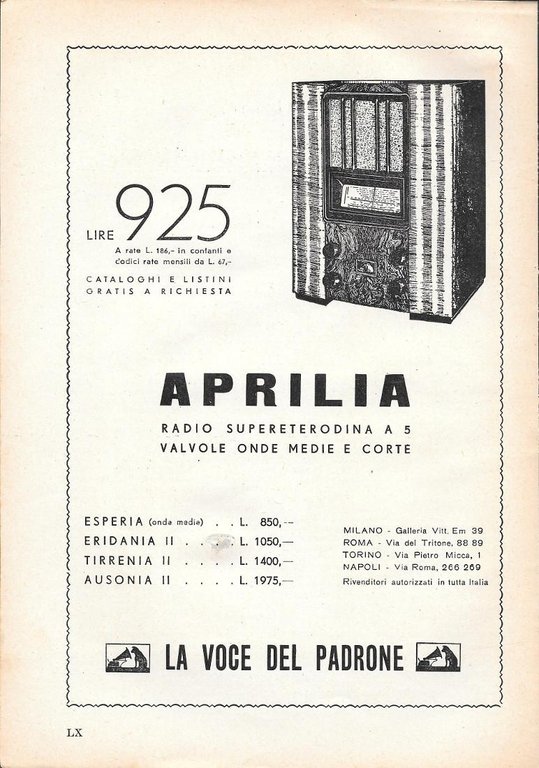 Aprilia. Radio supereterodina a 5 valvole. La Voce del Padrone. Advertising 1935