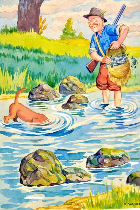 24 x 16cm. Dessin mis en couleurs, sur papier fort. Cette épreuve originale représente avec un humour léger un chasseur. Il a les jambes de pantalon relevées, et se tient, l'air ravi, debout, les pieds dans un petit cours d'eau; à son côté, son chien plonge et semble lui pêcher les écrevisses, qui peu à peu remplissent sa gibecière. En arrière plan, deux lièvres, les yeux ronds, pointent leurs oreilles cachés derrière un arbre.