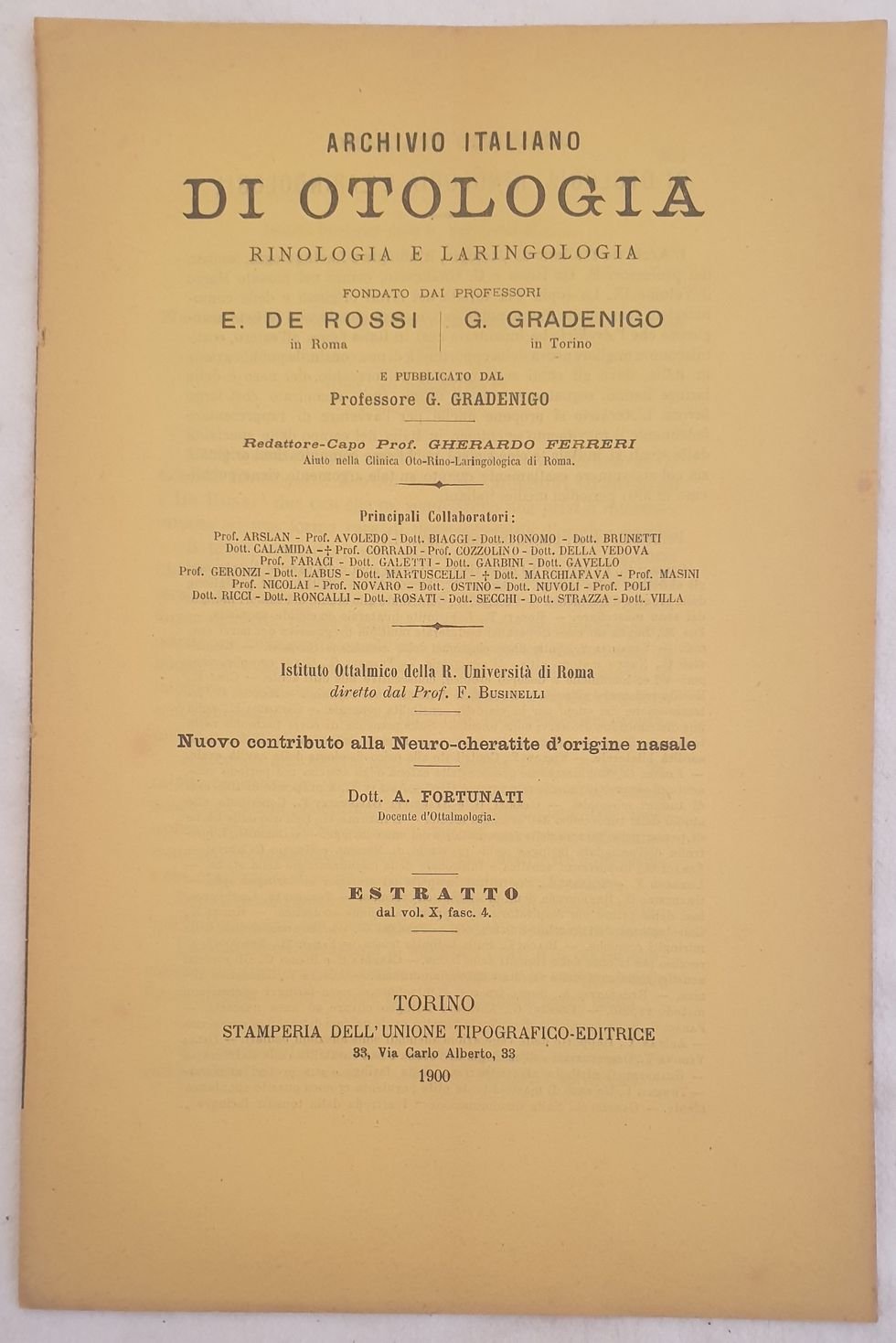 Contributo di otologia del 1900 del Dott. A. Fortunati sulla neuro cheratite di origine nasale. Estratto dal Vol. X fasc. 4. In buone condizioni. Copertina editoriale in buone condizioni generali con lievi usure ai margini e dorso Legatura in buone condizioni. All'interno le pagine si presentano in buone condizioni con rare fioriture. Piegatura verticale. In 8. cm 24,5x16. Pp. da 433 a 438.Contribute of otology of 1900 by Dott. A. Fortunati about neuro cheratite from the nose. Extract fromVol. X fasc. 4. In good condition Editorial cover in good conditions lightly worn in the extremities. Binding in good condition. Pages in good conditions with occasional foxing. Vertical folding. In 8. cm 24,5x16. Pp. from 433 to 438.
