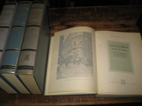 3 volumi in-4° (305x222mm), tra le 450 e le 600 pp. ca. ogni volume, legatura editoriale t. tela azzurra con titolo e impressioni in oro e in nero ai dorsi e sovraccoperte illustrate. Ogni volume è adorno di decine di tavole fotografiche a colori applicate f.t.; numerose altre illustrazioni in b.n. n.t. e f.t. e riproduzioni di marche e di punzoni n.t. Con indici delle località, dei bolli, delle figure e dei simboli catalogati, degli argentieri e degli orafi. Perfetto stato. Dedica autografa di Costantino Bulgari all'occhietto del primo vol. Prima edizione (3 volumi su 6 di cui si compone l'opera). Opera monumentale e di assoluto riferimento sugli orafi, gli argentieri e i gemmari del Centro Italia, di cui costituisce un elenco ragionato suddiviso per rigorosi ordini alfabetici e regionali (gli ordinamenti regionali rispecchiano quelli dei confini degli Stati italiani prima dell'invazione napoleonica, e confermati dopo la Restaurazione del 1815). L'opera, edita nel corso degli anni da diversi tipografi, è così ripartita: 1) Parte prima. Roma. 2) Parte prima [volume secondo]. Roma. 3) Parte quarta. Emilia.