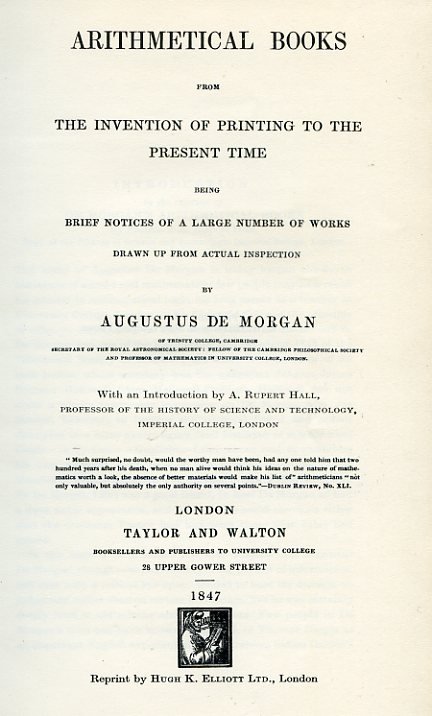 Arithmetical Books from the invention of printing to the present time being brief notices of a large number of works drawn up from actual inspection. With an introduction by A. Rupert Hall, professor of the History of Science and Technology.