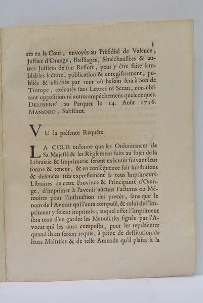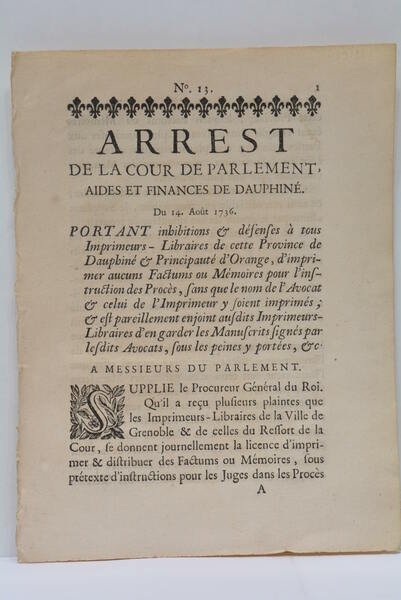 ARREST DE LA COUR DE PARLEMENT, AIDES ET FINANCES DE DAUPHINÉ. Portant inhibitions et défenses à tous Imprimeurs-Libraires de cette Province de Dauphiné et Principauté d'Orange, d'imprimer aucun Factums ou Mémoires pour l'instruction des Procès, sans que le nom de l'Avocat et celui de l'Imprimeur y soient imprimés; et est pareillement enjoint ausdits Imprimeurs-Libraires d'en garder les Manuscrits signés par lesdits Avocats, sous les peines et portées.
