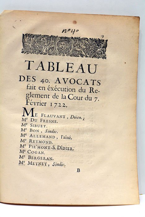 12 pages. (23x17 Cm). Dérelié. Trace de couverture au dos. Petit trou de vers sans atteinte au texte. Petite déchirure en marge inférieure en premier feuillet. Légères tâche brune. Dernier cahier partiellement dérelié. Présentation sous forme de liste des quarante avocats nommés pour plaider et postuler devant la Cour. En pages 4, 5 et 8 l'encre a légèrement bavé. Le tableau des 40 avaocats concernés partiellement dérelié.
