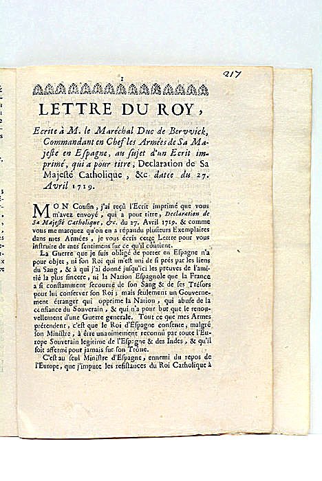 ARREST DE LA COUR DE PARLEMENT DE BORDEAUX, PORTANT SUPPRESSION DE L'ECRIT QUI A ÉTÉ RÉPANDU SOUS LE NOM DE DÉCLARATION FAITE PAR LE ROI CATHOLIQUE le 25 Decembre 1718. Fait défenses à toute sorte de Personnes de le vendre, distribuer, imprimer ni garder : Ordonne que tous ceux qui en auront des Exemplaires seront tenus de les apporter au Greffe de la Cour. Bordeaux, 1719. RELIÉ AVEC : 2). LETTRE DU ROY, ÉCRITE À M. LE MARÉCHAL DUC DE BERVICK, COMMANDANT EN CHEF LES ARMÉES DE SA MAJESTÉ EN ESPAGNE, au sujet d'un Écrit imprimé, qui a pour titre, Declaration de Sa Majesté Catholique, et datée du 27 Avril 1719. Toulouse, Claude-Gilles Lecamus, 1719.