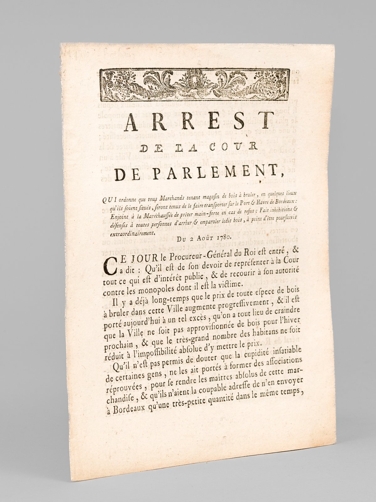 1 brochure in-8, Chez Jean Chappuis, Imprimeur de la Cour de Parlement, sur les Fossés de Ville, A Bordeaux, 1780, 4 pp. Rappel du titre complet : Arrest de la Cour de Parlement, Qui ordonne que tous Marchands tenant magasin de bois à brûler, en quelques lieux qu'ils soient situés, seront tenus de le faire transporter sur le Port & Havre de Bordeaux : Enjoints à la Maréchaussée de prêter main-forte en cas de refus : Fait inhibitions & défenses à toutes personnes d'arrher & emparole ledit bois, à peine d'être poursuivis extraordinairement. Du 2 Août 1780 Très remarquable arrêt du Parlement de Bordeaux, dont le texte expose les motifs : "Il y a déjà long-temps que le prix de toute espèce de bois à brûler dans cette Ville augmente progressivement, & il est porté aujourd'hui à un tel excès, qu'on a tout lieu de craindre que la Ville ne soit pas approvisionnée de bois pour l'hiver prochaine, & que le très-grand nombre des habitans ne soit réduit à l'impossibilité absolue d'y mettre le prix. Qu'il n'est pas permis de douter que la cupidité insatiable de certaines gens, ne les ait portés à former des associations réprouvées, pour se rendre les maîtres absolus de cette marchandise, & qu'ils n'aient la coupable adresse de n'en envoyer à Bordeaux qu'une très-petite quantité dans le même temps ou par la même marée, afin d'en soutenir le prix, & de le faire augmenter". Bon état.
