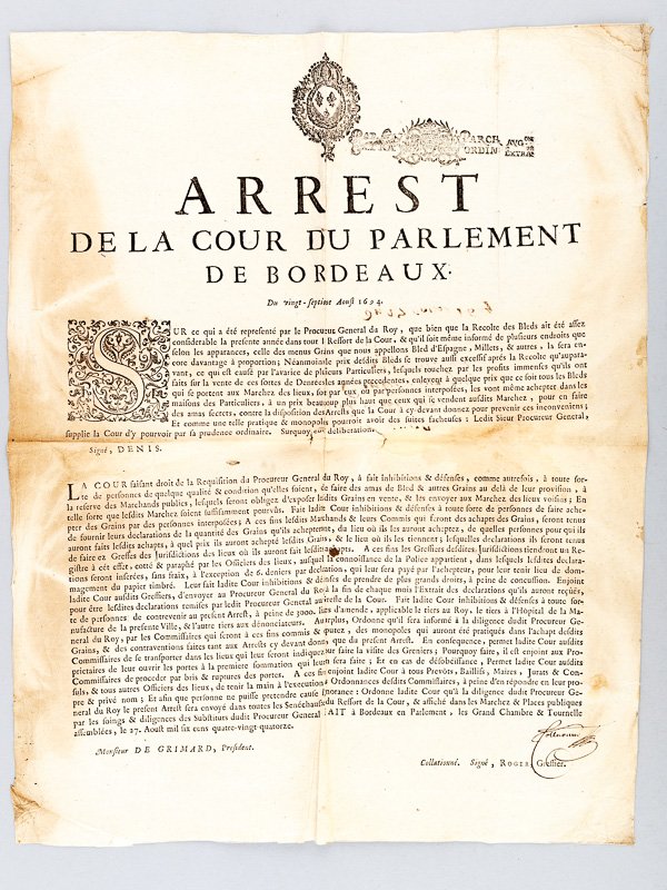 1 placart au format 47 x37 cm, Bordeaux, 1694, collationné et signé par Roger, greffier. Rappel du titre complet : Arrest de la Cour du Parlement de Bordeaux du vingt-septième Aoust 1694 [ Affiche : Lutte contre la spéculation sur le blé et les grains au lendemain du "grand hyver" de 1693-1694 ] "Sur ce qui a été représenté par le Procureur General du Roy, que bien que la Recolte des Bleds ait été assez considerable la presente année dans tout le Ressort de la Cour, & qu'il soit même informé de plusieurs endroits que selon les apparances, celles des menus Grains que nous appelons Bled d'Espagne, Millets, & autres, la sera encore davantage à proportion ; Néanmoins, le prix desdits Bleds se trouve aussi excessif après la Récolte qu'auparavant, ce qui est causé par l'avarice de plusieurs Particuliers, lesquels touchez par les profits immenses qu'ils ont faits sur la vente de ces sortes de Denrées les années précédentes, enlevent à quelque prix que ce soit tous les Bleds qui se portent aux Marchez des lieux, soit par eux ou par personnes interposées, les vont même achepter dans les maisons des Particuliers, à un prix beaucoup plus haut que ceux qui se vendent ausdits Marchez, pour en faire des amas secrets, contre la disposition des Arrests que la Cour à cy-devant donnez pour prevenir ces inconveniens" . "La Cour faisant droit de la Requisition du Procureur General du Roy, a fait inhibitions & défenses, comme autrefois, à toute sort de personnes de quelque qualité & condition qu'elles soient, de faire amas de Bleds & autres Grains au delà de leur provision, à la reserve des Marchands publics, lesquels seront obligez d'exposer lesdits Grains en vente, & les envoyer aux Marchez des lieux voisins ; En telle sorte que lesdits Marchez soient suffisamment pourvus". Etat très satisfaisant (anc. mouill. et petits accrocs en pliure) pour ce remarquable témoignage de la lutte contre la spéculation sur les grains au lendemain du terrible hiver de la fin 1693, l'un des deux "grants hyvers" avec celui de 1709, et responsable de près d'1.7 millions de victimes pour le seul Royaume de France). "Sur ce qui a été représenté par le Procureur General du Roy, que bien que la Recolte des Bleds ait été assez considerable la presente année dans tout le Ressort de la Cour, & qu'il soit même informé de plusieurs endroits que selon les apparances, celles des menus Grains que nous appelons Bled d'Espagne, Millets, & autres, la sera encore davantage à proportion ; Néanmoins, le prix desdits Bleds se trouve aussi excessif après la Récolte qu'auparavant, ce qui est causé par l'avarice de plusieurs Particuliers, lesquels touchez par les profits immenses qu'ils ont faits sur la vente de ces sortes de Denrées les années précédentes, enlevent à quelque prix que ce soit tous les Bleds qui se portent aux Marchez des lieux, soit par eux ou par personnes interposées, les vont même achepter dans les maisons des Particuliers, à un prix beaucoup plus haut que ceux qui se vendent ausdits Marchez, pour en faire des amas secrets, contre la disposition des Arrests que la Cour à cy-devant donnez pour prevenir ces inconveniens" . "La Cour faisant droit de la Requisition du Procureur General du Roy, a fait inhibitions & défenses, comme autrefois, à toute sort de personnes de quelque qualité & condition qu'elles soient, de faire amas de Bleds & autres Grains au delà de leur provision, à la reserve des Marchands publics, lesquels seront obligez d'exposer lesdits Grains en vente, & les envoyer aux Marchez des lieux voisins ; En telle sorte que lesdits Marchez soient suffisamment pourvus".