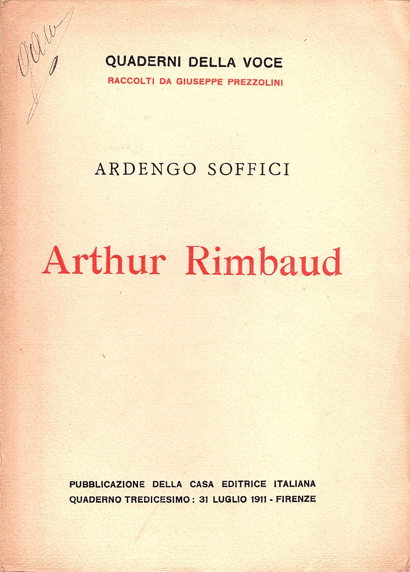 In-8°, pp. 141, (3), brosura editoriale entro velina. Bell'esemplare in barbe (una firma). Prima edizione. Soffici dedicò commossamente lo studio 'alla ignota Signora milanese che soccorse e forse amò Rimbaud affamato, vagabondo per l'Italia'. Quaderni della Voce. Spaducci, p. 278. Gambetti / Vezzosi, p. 874.