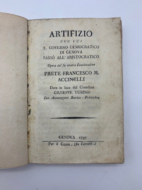 In 24 (cm 10 x 14,5), pp. XVI + 150. Brossura rifatta con carta antica. Edizione originale di questo pamphlet politico di Francesco Accinelli, pubblicato postumo da Giuseppe Tubino nel 1797, a vent'anni di distanza dalla morte dell'autore avvenuta nel 1777, e dato alle stampe in epoca rivoluzionaria all'indomani della proclamazione della Repubblica Ligure. A democrazia appena proclamata, uscirono infatti alcuni scritti anti-aristocratici fra cui spiccava in particolare quest'opera in cui Accinelli idealizzava il passato comunale di Genova, e il suo regime politico prima del 1528, e dava avvio alla copiosa storiografia sul Medioevo genovese. "Il prete Francesco Maria Accinelli e' forse il grande sottovalutato della cultura genovese del Settecento. La sua indefessa attivita' di poligrafo, versato nella storia ecclesiastica e profana come nella cartografia, viaggiatore nel dominio di Terraferma e in Corsica, ha lasciato consistenti tracce nelle biblioteche genovesi, e non solo. Nessuno meglio di lui diede voce al patriottismo municipale, che assicuro' nella crisi della guerra di Successione austriaca, la sopravvivenza della Repubblica patrizia. Era un municipalismo virulento tanto nei confronti dei corsi ribelli (Accinelli deploro' la cessione dell'isola come il piu' tradizionalista dei patrizi), quanto delle pretese imperiali di supremazia su Genova, che si affanno' a confutare. Gli avversari del governo patrizio ebbero dunque in lui un formidabile contraddittore, pronto a gettare nella polemica il peso di una erudizione alluvionale, malamente contenuta in antiquati schemi annalistici continuamente travolti da digressioni e ricapitolazioni, spesso appoggiate a ricerche d'archivio. Ma era anche un patriottismo popolare che nell'opera per la quale fu a suo tempo piu' noto, l'anonimo 'Compendio delle storie di Genova' (ripubblicato nella versione completa solo in eta' risorgimentale), non risparmiava le critiche al patriziato, imputato di tiepidezza nella difesa della liberta' e degli interessi di Genova" (Carlo Bitossi, "La Repubblica e' vecchia. Patriziato e governo a Genova nel Settecento", 1995, p. 200). Proprio il Compendio dell'Accinelli, uscito anonimo e con falso luogo di stampa nel 1750, provoco' le ire del conte Ferdinando Arborio Gattinara di Sartirana, ministro sardo a Genova, di cui l'Autore aveva parlato male. Manno riferisce che l'opera fu fatta bruciare in piazza Banchi a Genova nel 1752. Accinelli si rifugio' in Svizzera e torno' a Genova solo quando il conte di Sartirana fu sostituito dal conte Ferrero di Lavriano.