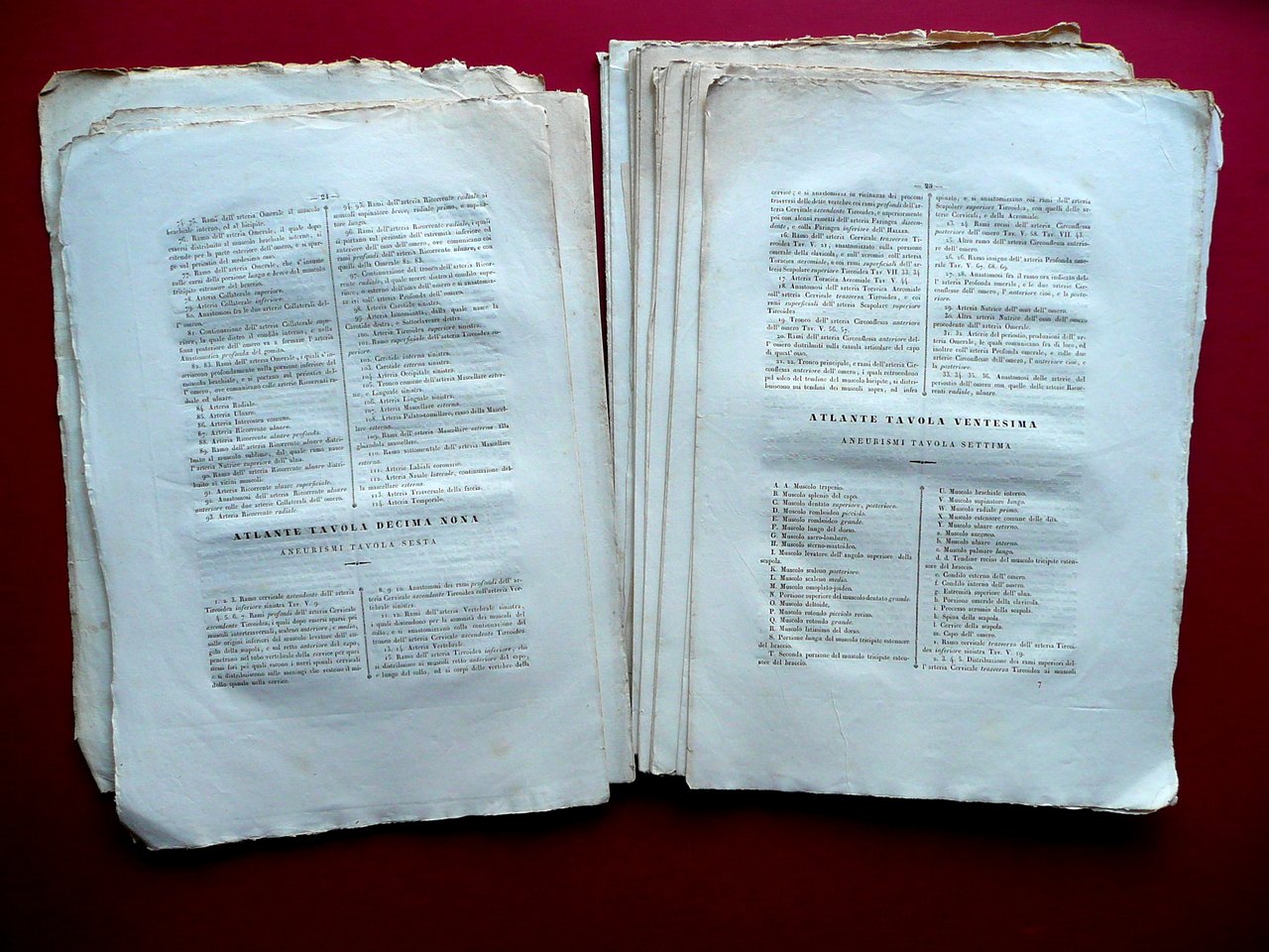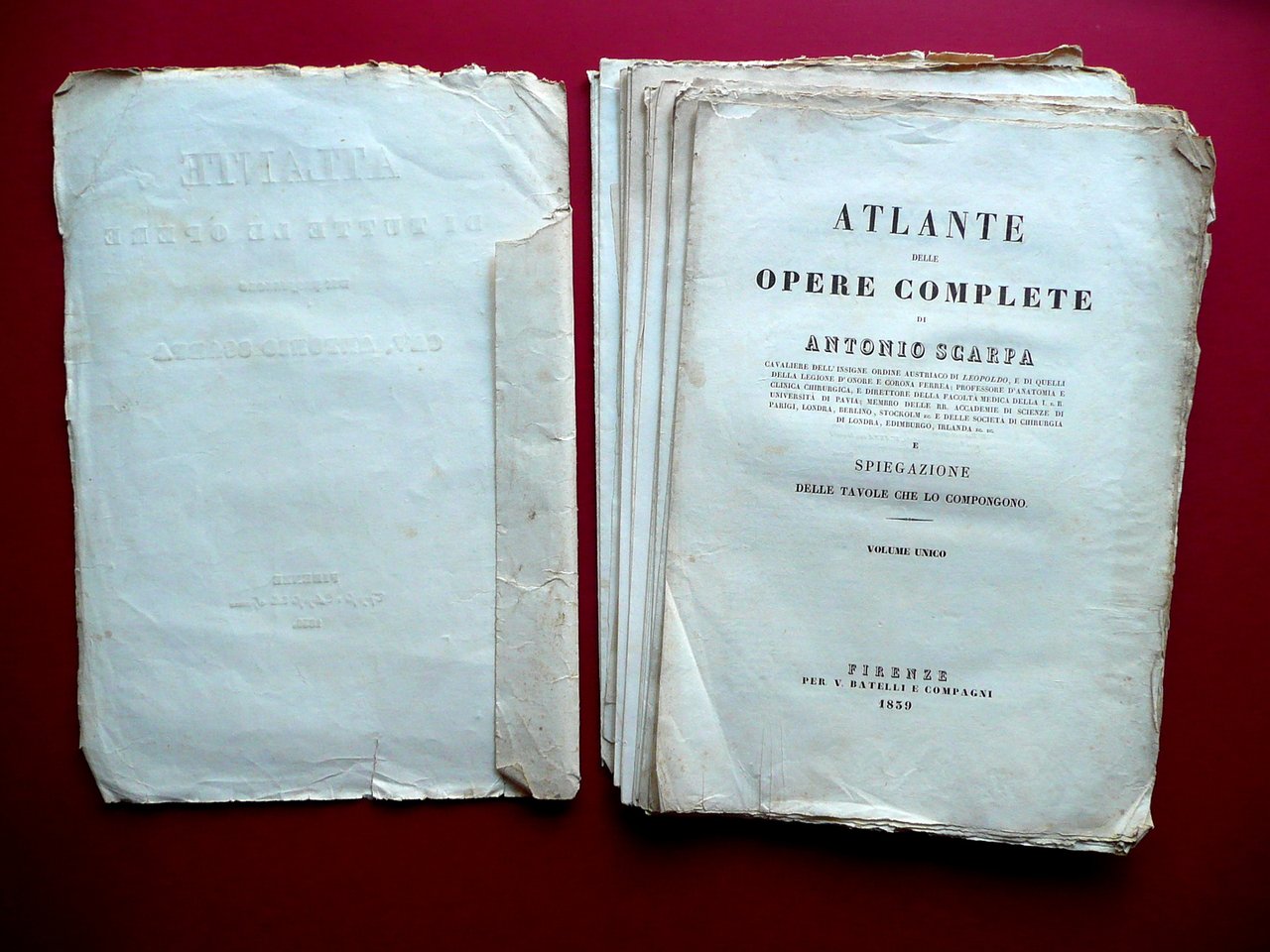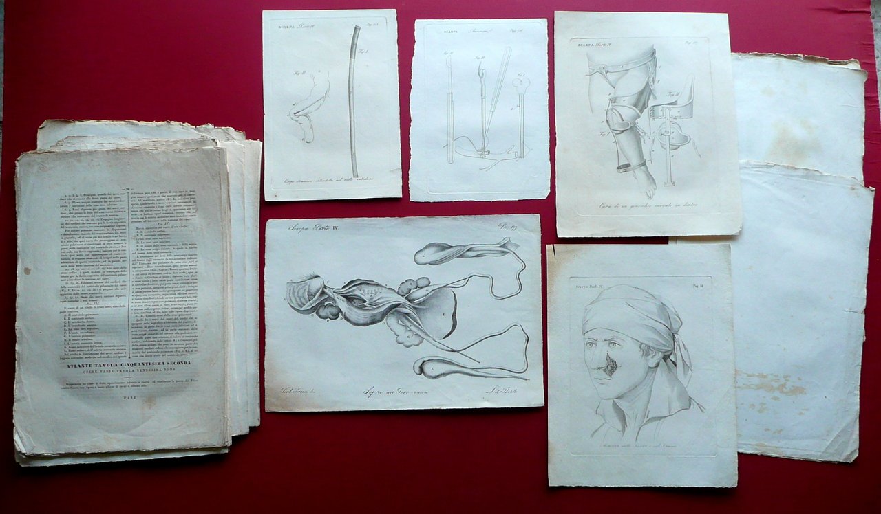 Atlante di tutte le opere del professore Cav. Antonio Scarpa Per V. Batelli e Compagni, Firenze 1839; cm 39,5x27,5; pp. 96 di testo, pi√π 7 belle tavole incise in b/n. Esemplare a fogli sciolti (mancanza della legatura). Condizioni di conservazione Esemplare in modeste condizioni con tracce d'uso, alcune leggere bruniture e aloni, qualche pagina con lievi tracce di sporco. Angoli di alcune pagine con piccola pieghetta. In condizioni come da foto e da descrizione. Non completo (presenza di sole sette tavole). SETT190.L19016 N