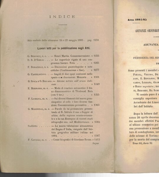 Tavole disegnate b.n. rip. f.t. Indice: Berchet G. - Henri Martin commemorazione. D'Emilio D.R. - Le superficie rigate di una congruenza lineare, nota. Bonatelli F. - Discussioni gnoseologiche e note critiche (continuazione e fine). Castelnuovo G. - Angoli di due spazi contenuti nello spazio a dimensioni, memoria. Spica G. e Biscaro G. - Alcune notizie sullarum italicum. Bernardi E. - Modo di rendere automatico il freno dinamometrico di Thiabaud, nota. Lussana F. - Sui diversi filamenti del nervo gransimpatico al collo e loro diverse funzioni, comunicazione preventiva. Marinelli G. - Parole da lui pronunciate presentando al R.Istituto il suo Saggio di altim, della regione veneto orientale e la sua Rassegna di recenti studi idrografici nel Mediterraneo. Suddetto - La nuova valutazione areometrica del regno d'Italia eseguita dall'Istituto geografico militare italiano nel 1884. Cavalli F. - Cenni biografici di Giordano Bruno. Abetti A. - Osservazioni astronomiche fatte all'Osservatorio di Padova coll'equatoriale Dembowski nell'autunno 1884. Ricci G. - Sulla integrazione della equazione. Tono M. - Bollettino meteorologico dell'Osservatorio del Seminario Patriarcale di Venezia (Gennaio e Febbraio 1885)