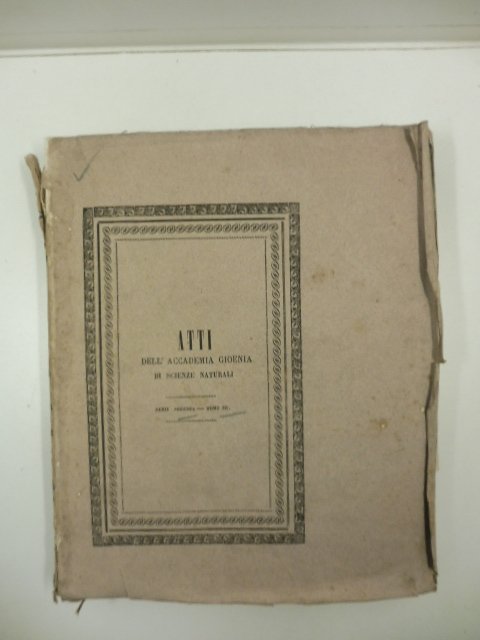 In 8, pp. VI + 437 + (6) con 8 tavv. f.t. inc. all'acq. Qualche taglietto ai margg. inf. delle cc. Usuali fioriture della carta. Mancanze al d. Br. ed. Contiene: Notizia d'una carta topografica-botanica per la Sicilia Di Francesco Tornabene; Floria dei dintorni di Avola. Con descrizione dalla sesta all'ottava classe linneana di Giuseppe Bianca; Sui crateri di sollevamento e di eruzione. Memoria di carlo Gemmellaro; Sullo sviluppo dell'equazione del centro, del raggio vettore e del suo logaritmo di Giuseppe Zurria; Descrizione di varie specie nuove di conchiglie viventi e fossili della Sicilia di Andrea Aradas; Boschi dell'Etna; Di un nuovo genere di polpajo fossile. Esame di C. Gemmellaro; Continuazione della descrizione di varie specie nuove malacologiche della Sicilia di Andrea Aradas; Dell'azione del metallo potassio sul bombace e sulla carta fulminante di Gaetano Mirone; Flora dei dintorni di Avola; Saggio sulla costituzione fisica dell'Etna di C. Gemmellaro; Osservazioni ed aggiunte alla fauna dei molluschi della Sicilia di R. A. Fhilippi; Su la grande ottarda, sull'anitra casarca e sul Pelecano bruno. Osservazioni di M. Zuccarello Patti.