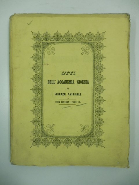 In 8, pp. 385 + (1b) + (1) + (1b) + (1) + (1b) con 7 tavv. in lit. f.t. di cui una rip. Intonso. Sporadiche fioriture. Br. ed. Contiene: Relazione dei travagli scientifici eseguiti nell'anno XXXI dell'Accademia Gioenia di Scienze Naturali in Catania; Di Giacomo, Cenno sopra un caso di moccio acuto nell'uomo osservato nello spedale S. Marco di Catania; Berretta Giuffrida, Esposizione di un caso di estraordinaria fecondita' muliebre ovvero di ventidue gravidanze gemelle successive; De Gaetani, Memoria della nomenclatura chimica; Sciuto-Patti; Relazione geognostica delle colline delle torreforti che si estendono ad occidente di Catania; Descrizione di alcune specie minerali dei vulcani estinti di Palagonia; Reina, Sulle fratture complicate. Nuove osservazioni e riflessioni; Zurria, Memoria sulla diffrazione della luce; Tornabene Casinese, Monografia delle specie di Asparagus Spontanea sull'Etna.