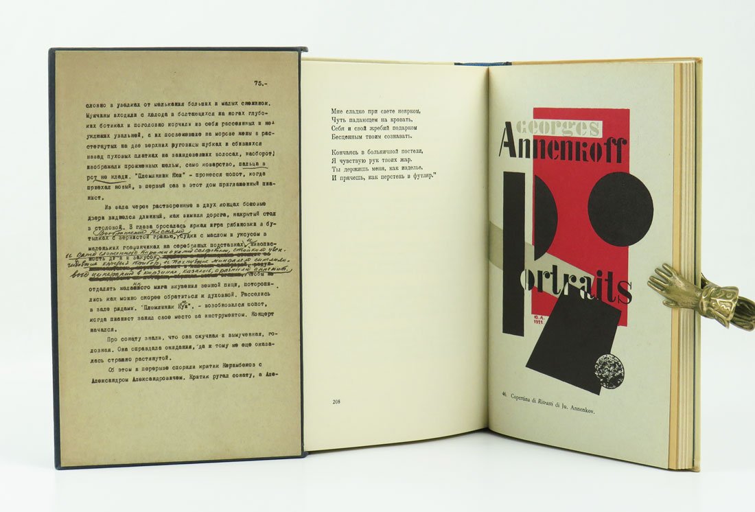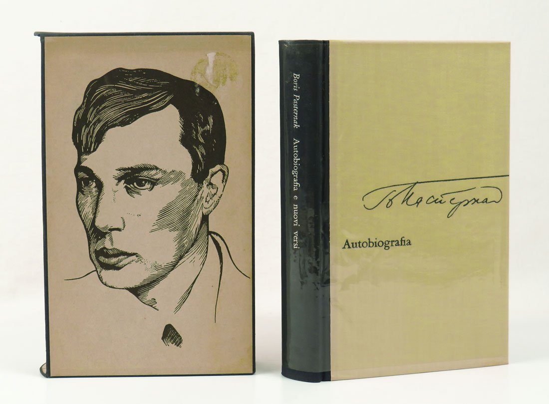 - mezza tela nera con piatti in tela color crema; conserva il cofanetto illustrato (ritratto di Pasternak e fac simile del dattiloscritto dell’«Autobiografia»),