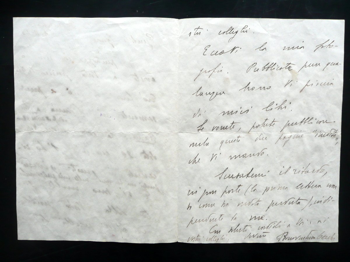Lettera autografa firmata, Bonaventura Tecchi (Bagnoregio 1896 - Roma 1968) Lettera autografa firmata datata Bagnoregio, 4 novembre 1940 Lettera interamente autografa firmata su bifolio in carta, datata Bagnoregio, 4 novembre 1940; testo disposto su due facciate, con firma autografa al termine del testo. Cm 18,5x13,5. Condizioni di conservazione Esemplare complessivamente in buono stato con tracce d'uso, pieghe di spedizione, lievi ondulazioni e tracce di vecchia umidità, parte inf. della terza e quarta facciata con qualche lieve alone da inchiostro dovuto ad umidità, i quali non compromettono la lettura del testo. Interessante contenuto letterario, in cui il Tecchi autorizza la pubblicazione di pagine dei suoi libri insieme alle due inedite che vi mando". SC03.D13421 N "
