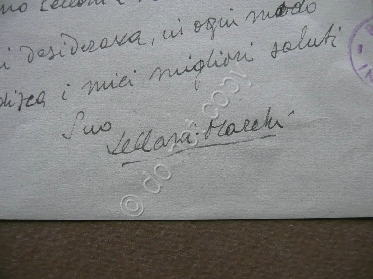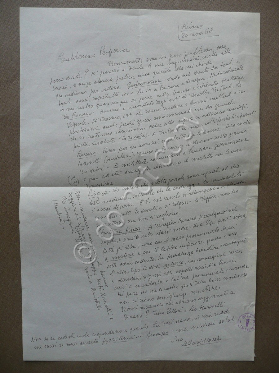 Lettera autografa, Mario Vellani Marchi (Modena 1895 - Milano 1979) lettera interamente autografa e firmata datata Milano, 24 novembre 1968 Lunga lettera interamente autografa e firmata, testo interamente disposto alla prima facciata, firma autografa del Vellani Marchi al termine del testo; cm 31,5x21. Un margine con timbretto - ex libris del precedente proprietario. Condizioni di conservazione Lettera in buone condizioni con tracce d'uso, normali pieghe di spedizione, un margine lievemente rifilato e con al retro qualche piccola traccia di precedente inserimento dell'esemplare entro volume. Bellissima lunga lettera interamente autografa e firmata, diretta al Professor Nannini di Modena, il quale aveva chieso al Vellani Marchi varie notizie e informazioni su Burano: gastronomia, lavoro, lingua, struttura fisica degli abitanti, pittori modenesi che vi abitarono. SC03.D9528 N