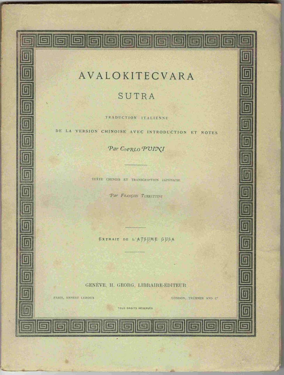Avalokitecvara sutra. Traduction italienne de la version chinoise avec introduction et notes par Carlo Puini. Texte Chinois et trascription Japonaise par François Turrettini. Extrait de L'Atsume Gusa