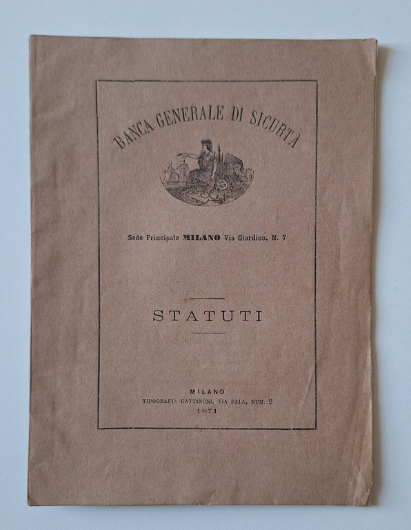 BANCA GENERALE DI SICURTA' STATUTI TIP. GATTINONI 1871In 8°, legatura editoriale cartacea.Lievissimi segni alla copertina.