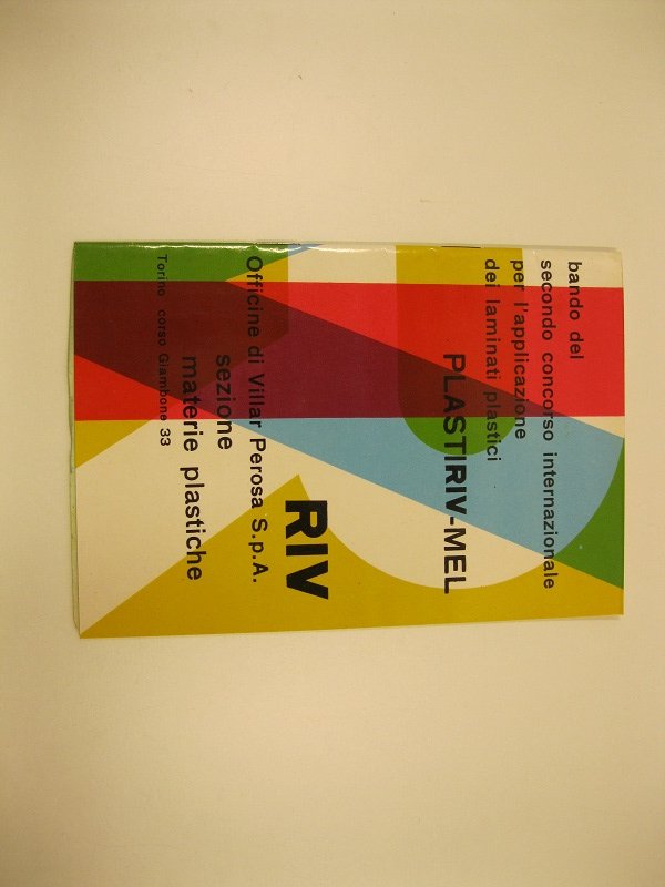 Brochure pubblicitaria, in 16, cm 11,5 x 16,5 per il secondo concorso indetto dal reparto laminati plastici della Riv per l'applicazione di questo materiale su mobili, arredamenti, veicoli e parti di prefabbricati. Nella commissione esecutiva risultano esserci l'arch. Gustavo Pulitzer, Gino Pestelli, M. Muzzoli, P. Bertolone. Di interesse la grafica della brossura editoriale che sovraqppone con 3 diversi colori le lettere del marchio Riv su di un cartone plastificato.
