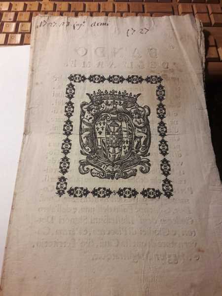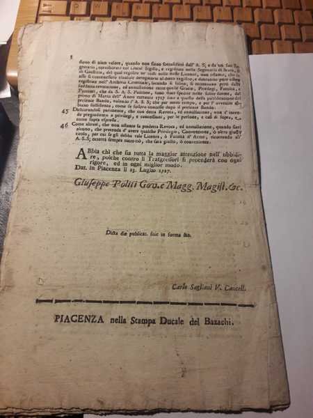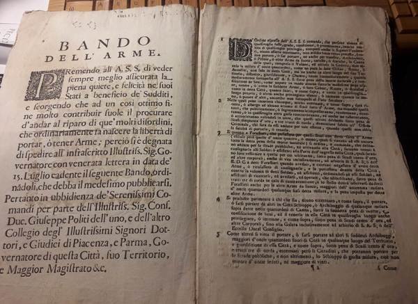 Edizione: Prima edizione . Pagine: 8 . Illustrazioni: In prima pagina grande e bello stemma del Ducato di Parma e Piacenza . Formato: 4° . Rilegatura: Fosci a fascicoli . Stato: Buono . Caratteristiche: Bando o grida promulgato sotto il Duca di Parma e Piacenza Antonio Farnese(1679-1731), ultimo Farnese del Ducato, regnante dal 1727 al 1731.Editto per la messa a bando di armi di libera circolazione. .