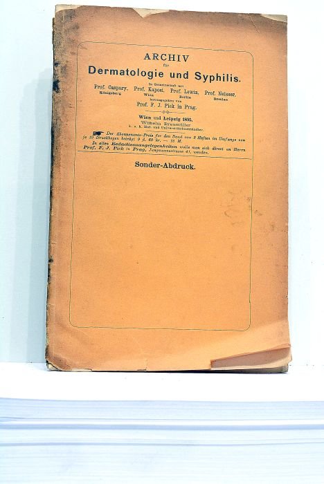 in-8. 27pp. Broché, couverture imprimée avec quelques défauts. Mouillure à la planche. Rousseurs éparses. Première édition de ce travail de dermatologie réalisé à Breslau dans le service de dermatologie de Joseph Jadasohn. 1 planche hors-texte en couleurs. Très rare tiré-à-part des "Archiv für Dermatologie und Syphilis".