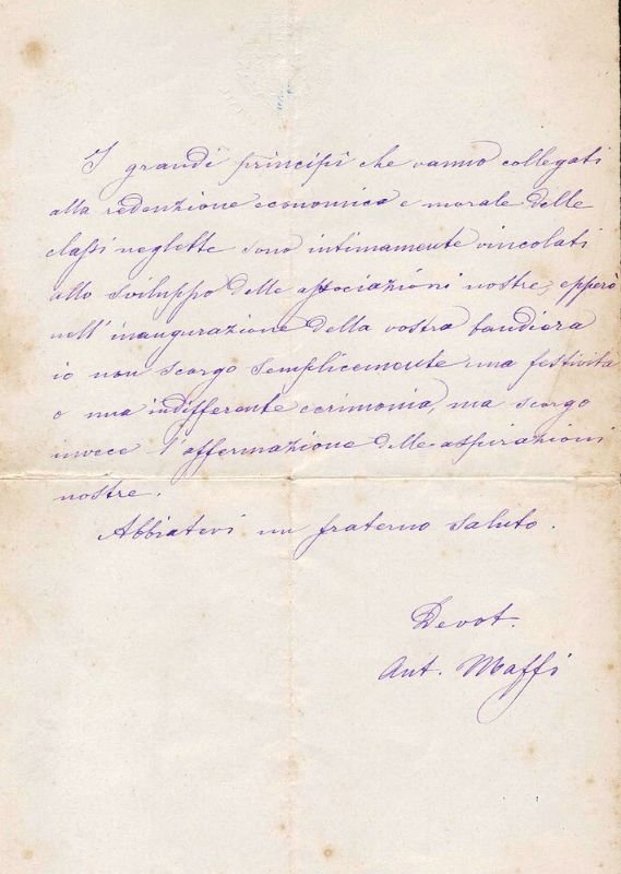 Foglio intestato Camera dei Deputati, scritto su entrambe le facciate per 30 righe più la firma, indirizzato alla 'Fratellanza operaia di Cortemggiore' e datato 'Roma, 1 marzo 1883'. Antonio MAFFI (Milano, 1850 – 1912) è stato un politico italiano, membro della Camera dei deputati del Regno d'Italia dal 1882 al 1892. Radicale su posizioni anarchico-libertarie, fu il primo operaio eletto alla Camera dei deputati. Tipografo, fu membro del Consiglio superiore del Lavoro. Massone, fu iniziato nel 1883 nella Loggia Spartaco di Roma. Si legge, tra l'altro: 'E' confortante per noi, è decoroso per il paese, è fecondo per l'avvenire lo sviluppo continuo dello spirito d'associazione, che alle masse di un tempo, chiedenti l'umiliante elemosina, sostituisce i previdenti lavoratori, che alle masse sfruttate a lungo dai privilegi e dagli interessi sostituisce i cittadini consapevoli e della propria dignità e della propria forza, come dei propri doveri.' Strappetto senza mancanze alla piegatura centrale.