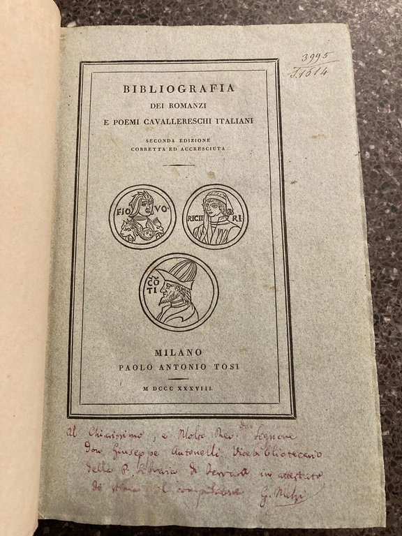 In-4° (265x158mm), pp. (4), VIII, 380. Legatura del tempo mezza pelle verde con titolo in oro sul dorso, dedica autografa del Melzi sulla brossura editoriale. Ottimo esemplare. Seconda edizione, corretta e ampliata, di questa referenziale bibliografia di oltre 800 tra romanzi e poemi cavallereschi italiani o tradotti in lingua italiana. Il Melzi (Milano, 1783-ivi, 1852) fu fra i principali cultori di ricerche bibliografiche del nostro Ottocento. Uomo di vasti interessi, appassionato di musica, fu legato d'amicizia a Donizetti.