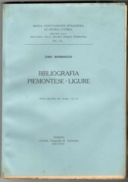 In 8°, pp. 157, (3). Brossura editoriale su carta verde. Copia in buono stato, interamente a fogli chiusi. Seconda parte della continuazione della bibliografia piemontese-ligure, iniziata da Ferdinando Gabotto. QUesto volume comprende le voci da N a R (non venne continuata a causa della morte dell'autore). Biblioteca della Società Storica Subalpina, vol. CL.