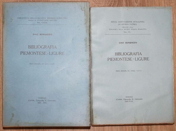 In 8°, pp. VII, (1), 766, (3 - 16 di pubblicità editoriale su carta verde); 157, (3). Brossura editoriale. Qualche segno del tempo e ingialliture. Copia in buono stato, interamente a fogli chiusi. Seconda parte della continuazione della bibliografia piemontese-ligure, iniziata da Ferdinando Gabotto. Le schede arrivano fino alla lettera R (non venne continuata a causa della morte dell'autore). Biblioteca della Società Storica Subalpina, vol. CXLIX - CL.