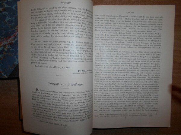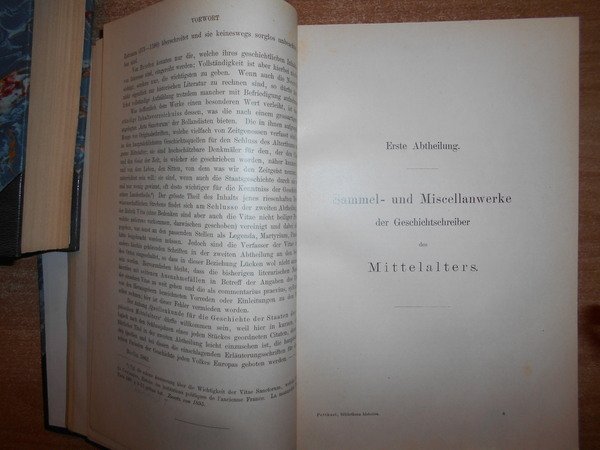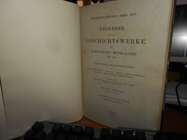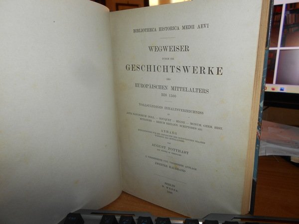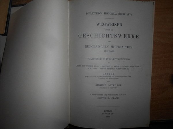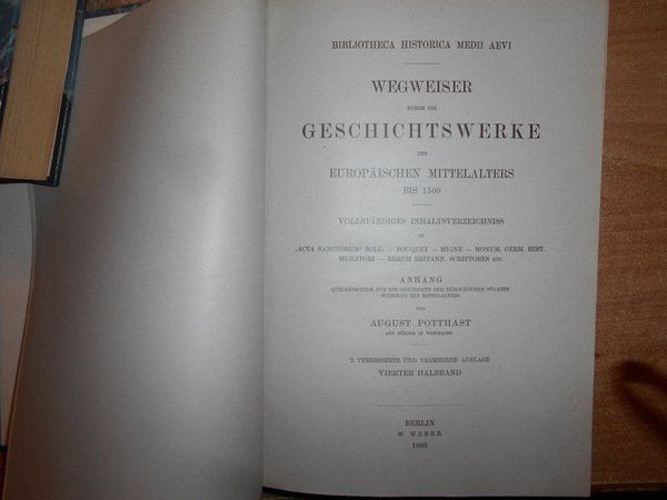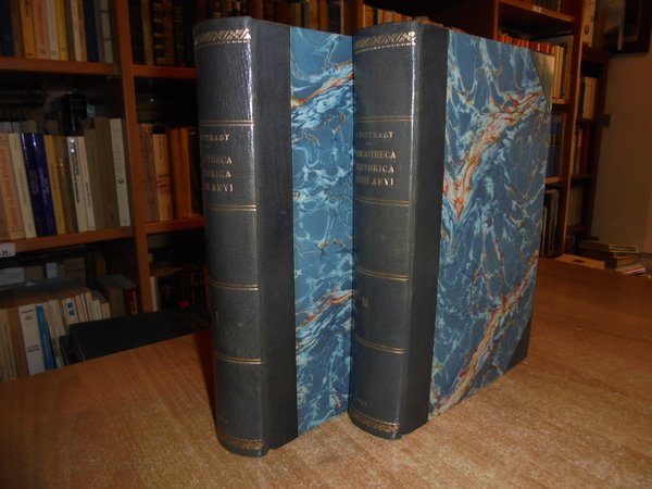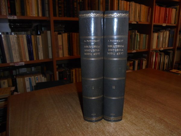 Von AUGUST POTTHAST. Berlin, W. Weber, 1895 - 1896. BIBLIOTHECA HISTORICA MEDII AEVI. 2 volumi in-8° grande, m. marocchino con larghe punte, titoli e fregi in oro ai dorsi, copertine originali conservate. cxlvii, 1749 pp. a numerazione continua. Splendido esemplare in prima edizione con le brossure originali conservate. Uff. E - II - 6 - 2