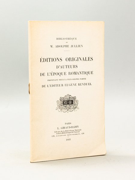 Bibliothèque de M. Adolphe Jullien. Editions originales d'auteurs de l'Epoque romantique provenant pour la plus grande partie de l'éditeur Eugène Renduel