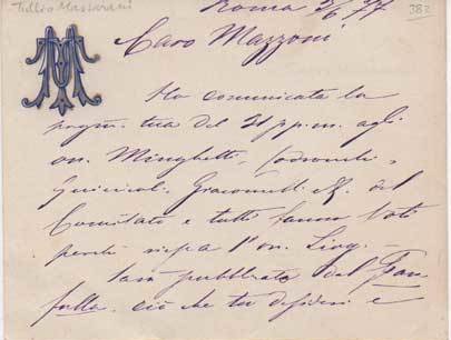 • 1 carta scritta recto e verso. Manoscritto a inchiostro nero su carta con monogramma di Massarani.