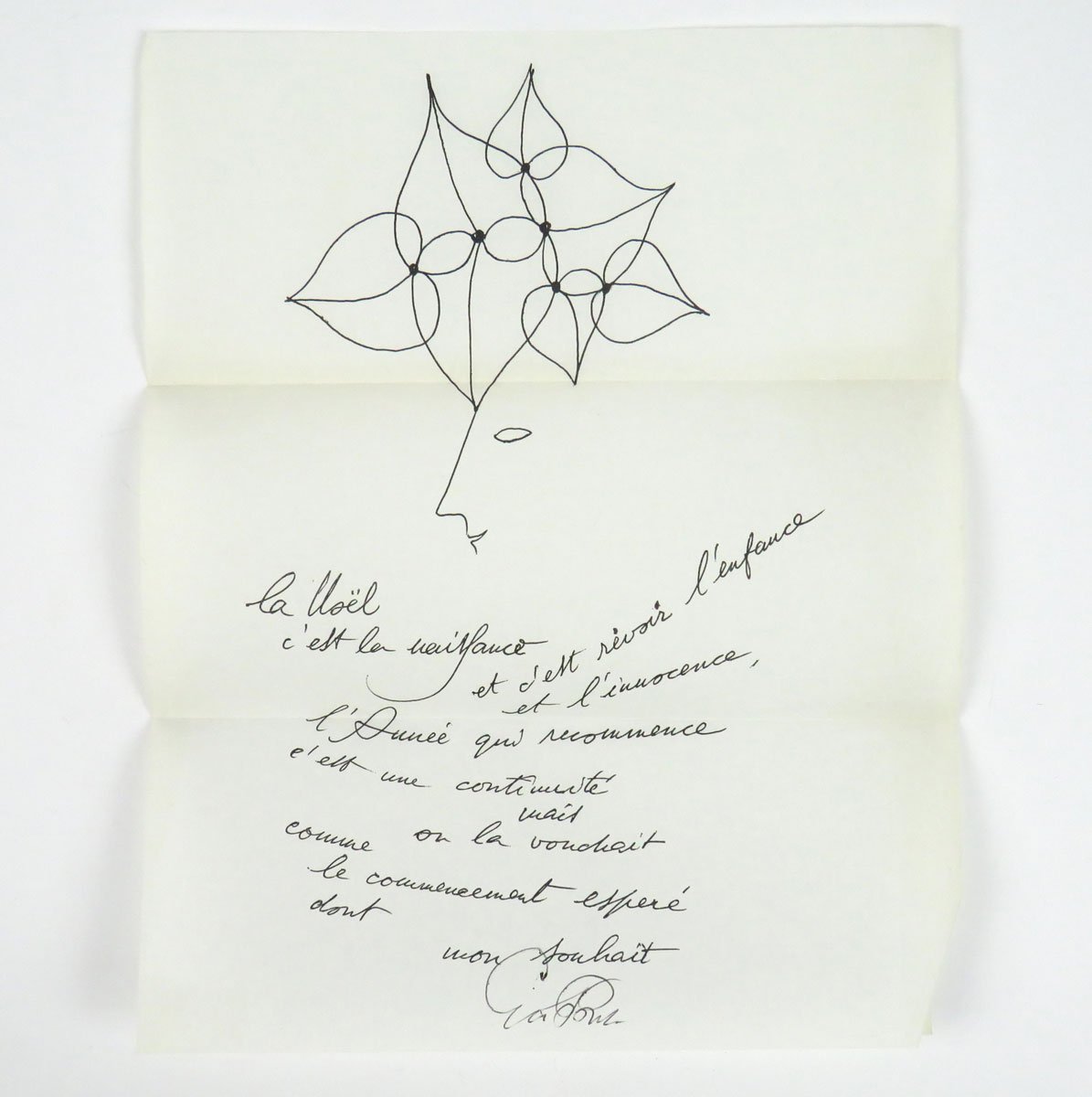 AUTOGRAFOCON AUTOGRAFO.«La Noel c'est la naissance / et c'est revoir l'enfance / et l'innocence, / l'Année qui recommence / c'est une continuité / mais on la voudrait / comme le commencement / esperé dont on souhait»
