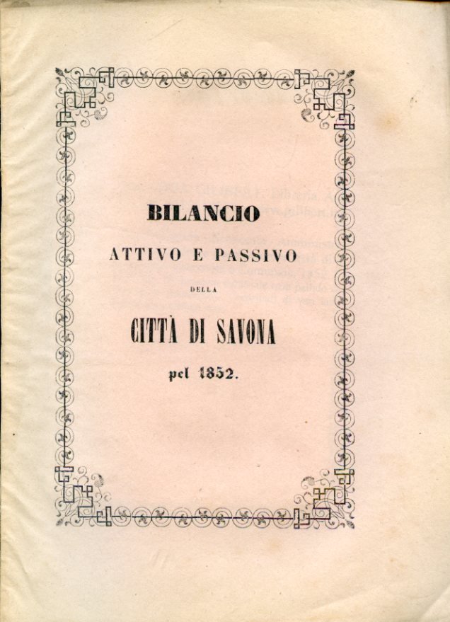 In-8°, pp. 76, brossura editoriale rosa pallido con titolo entro bordura ornamentale. Stemma di Savona al frontespizio. Contributi di vari autori, tra cui l'allora sindaco della città, Ignazio Carlevarini. Ottimo stato.