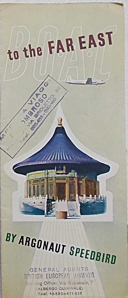 Pieghevole di 8 facciate di cm. 22 x 9,5 e altre 8 facciate di cm. 5,5 x 9,5; con grande "spaccato" a colori della cabina passeggeri e illustraz. fotograf. a colori; copertina grafica a colori della sisteamzione a bordo. Timbri. VG. ** L'Argonaut è il DC-4M-4s: nel 1949 la BOAC ne ordinò e ebbe in consegna 22 esemplari. Fu un Argonaut che il 6 febbraio 1952, alla morte del padre Re Giorgio, accorse in Kenya per portare a Londra la Regina Elisabetta.