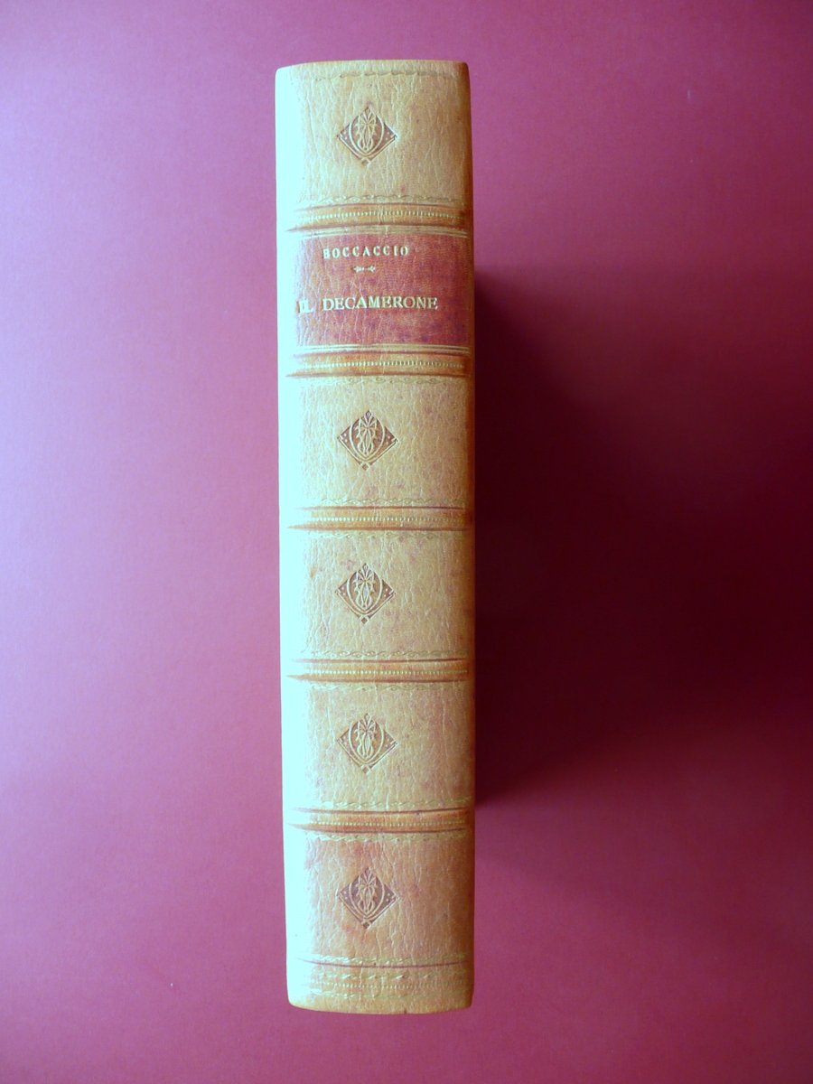 Giovanni Boccaccio, Il Decamerone a cura di Fernando Palazzi 101 tavole a colori di Gino Boccasile volume primo Edizioni d'Arte A la Chance du Bibliophile, Milano 1955; cm 36x26; pp. 602 con 101 bellissime tavole a colori realizzate da Gino Boccasile; pagine in carta forte con barbe. Elegante legatura in mezza pelle (dorso e angoli) con titolo e fregi impressi in oro al dorso con nervature, piatti marmorizzati. Presenza della brossura ed. originale (vedi foto). Volume primo. Condizioni di conservazione Esemplare ben conservato con tracce d'uso; coperta con alcune minime bruniture agli angoli dei piatti e al dorso in pelle. Interni buoni con poche minuscole bruniture; poche pagine con lievi tracce di pieghe; brossura ant. originale con minime tracce di sporco, una circoscritta macchietta e uno strappetto di alcuni cm restaurato per mezzo d'incollatura (vedi foto). Volume primo, che raccoglie tutte le novelle delle prime cinque giornate. Elegante e curata veste editoriale. SETT26.L15655 N
