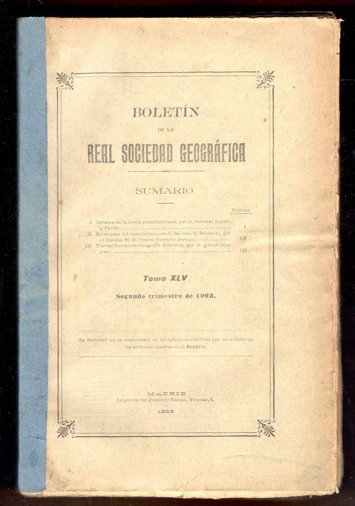 Tre fascicoli in 8°. I fascicoli, ognuno con la propria brossura, sono tenuti uniti dalla copertina originale del semestre (dorso foderato). Qualche difetto alle copertina ma copia in ordine, a fogli chiusi. Tra i vari articoli si segnala: DOPORTO y UNCILLA, Severiano. Tabasco en la epoca precolombiana. - FERNANDEZ DURO, Cesareo. Relaciones del descubrimiento de las Islas de Salomon. - El Canal de Panama y el ferrocarril de Tehuantepec. - TAMAYO, J. M. El canal de los dos mares. (Con diverse illustrazioni nel testo e una tavola fuori testo). - GONZALEZ, Juan Maria. Archipielago Canario.