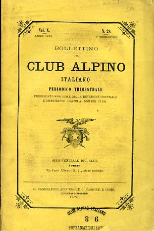 In-8°, pp. 385-536; brossura editoriale gialla con stemma del C.A.I. e titolo entro bordura ottagonale con fiorellini accantonati. Alcune illustrazioni xilografiche n.t. e f.t. In fine, tre tavole ripiegate impresse al recto e al verso di osservazioni meteorologiche. Buon esemplare con segni a matita rossa. Contributi di vari autori (Fenzi, Barale, Gorret Amé, Cederna, Vaccarone, Mariani, Modoni, Isaia, ecc.) sull'isola di Ceylon, il Dente d'Ambin, il Mont Favre, l'Ortler Spitz, il Gruppo della Levanna, il Monte Taleo, Montovolo e Montevigese, la Cima di Piazzi, il Lago Regillo e Gabii, il Legnone, l'Aiguille della Maison Blanche ora Munterasch d'Entremont, il Pisanino, il Gran Paradiso, le Grandes Jorasses, il Monviso, la Punta Giordani del Monte Rosa, il Sirente e il Gruppo della Maiella in Abruzzo, il Monte Serva, il Felikjoch, ecc. Perret, 4688.