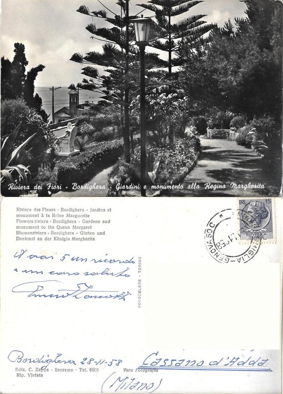 Bordighera. Giardini e Monumento alla Regina Margherita. Viaggiata 1958