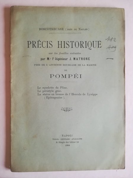In 8 (cm 18,5 x 26), pp. 34 con 1 grande tavola finale ripiegata con planimetria del luogo dello scavo, 4 riproduzioni fotografiche in bianco/nero dei ritrovamenti archeologici. Brossura editoriale. Saggio in lingua francese sui ritrovamenti archeologici venuti alla luce durante gli scavi che lingegnere Gennaro Matrone fece condurre nel suo terreno vicino alla spiaggia di Stabia. Vennero ritrovati 72 scheletri, Matrone avverti' le autorita' che non lo presero pero' in considerazione. Un diplomatico francese lo avverti' della possibilita' che tra quegli scheletri ci fosse quello di Plinio il vecchio. Matrone se ne convinse ma la comunita' scientifica reagi' alla notizia con ironia mista a scetticismo. Matrone conservo' il cranio (riprodotto fotograficamente nel testo), privo della mascella superiore, e la spada delluomo misterioso. Nel 2010 larcheologo Flavio Russo riprese lipotesi dellappartenenza del cranio a Plinio. Con unanalisi isotopica si scopri' in realta' che Matrone aveva unito i resti, il cranio e la mandibola, di due uomini diversi. Altri studi recenti hanno portato ad affermare che molto alte sono le possibilita' che il solo cranio appartenga effettivamente a Plinio. Nel saggio la prima parte e' riservata ai resti di Plinio, seguono notizie su una statua di bronzo dellErcole di Lisippo e su un peristilio greco.